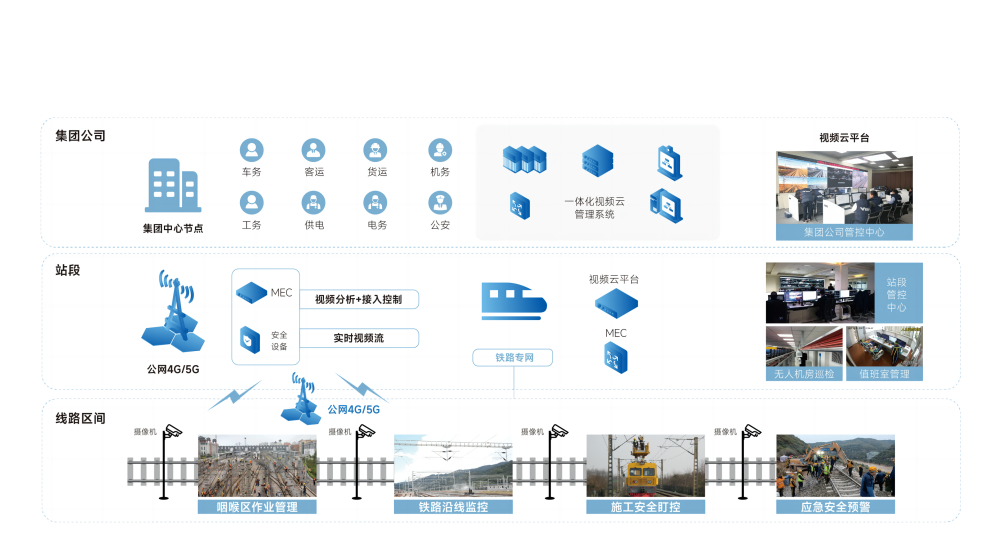 本方案基于飞鸿视频物联平台,采用容器技术以及微服务架构,由区域视频云节点、接入视频云节点两级云服务构成,构建集团公司、站段、现场三级联动可视化管控系统。实现对视频云平台的计算资源、存储资源、网络资源的统一纳管,将多线路、多专业视频融合成一张视频网,给予视频数据端到端的融合服务,建立视频监控资源价值链,实现业务感知、智能与联动,营造视频应用生态赋能业务,使能安全运营,提高运输效率。